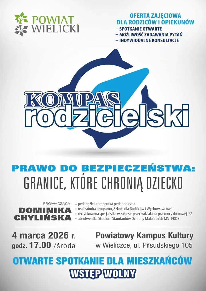 Pierwsze spotkanie z cyklu Kompas Rodzicielski nosi tytuł “Prawo do bezpieczeństwa - granice, które chronią dziecko”. Organizatorzy zapraszają osoby, które chcą zrozumieć, dlaczego jasne zasady pomagają w rozwoju i relacjach rodzinnych. Zajęcia poprowadzi Dominika Chylińska - pedagożka i terapeutka, realizatorka programu „Szkoła dla Rodziców i Wychowawców”, specjalistka ds. przeciwdziałania przemocy domowej oraz absolwentka Studium Standardów Ochrony Małoletnich MS i FDDS. Miejsce spotkania to Powiatowy Kampus Kultury, ul. Piłsudskiego 105.
