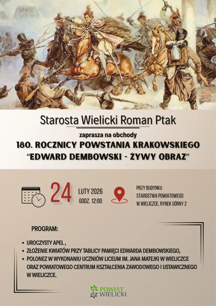 W Wieliczce przypomną jeden z epizodów z historii z silnym akcentem teatralnym i muzycznym. Podczas krótkiej inscenizacji organizatorzy chcą przywrócić uwagę na postać Edwarda Dembowskiego i atmosferę tamtych dni. W rolach wykonawców wystąpią uczniowie szkół powiatowych, a inicjatywę wspiera urząd powiatowy. To propozycja dla tych, którzy chcą uczcić pamięć uczestników Powstania Krakowskiego w kameralnej, miejskiej scenerii.